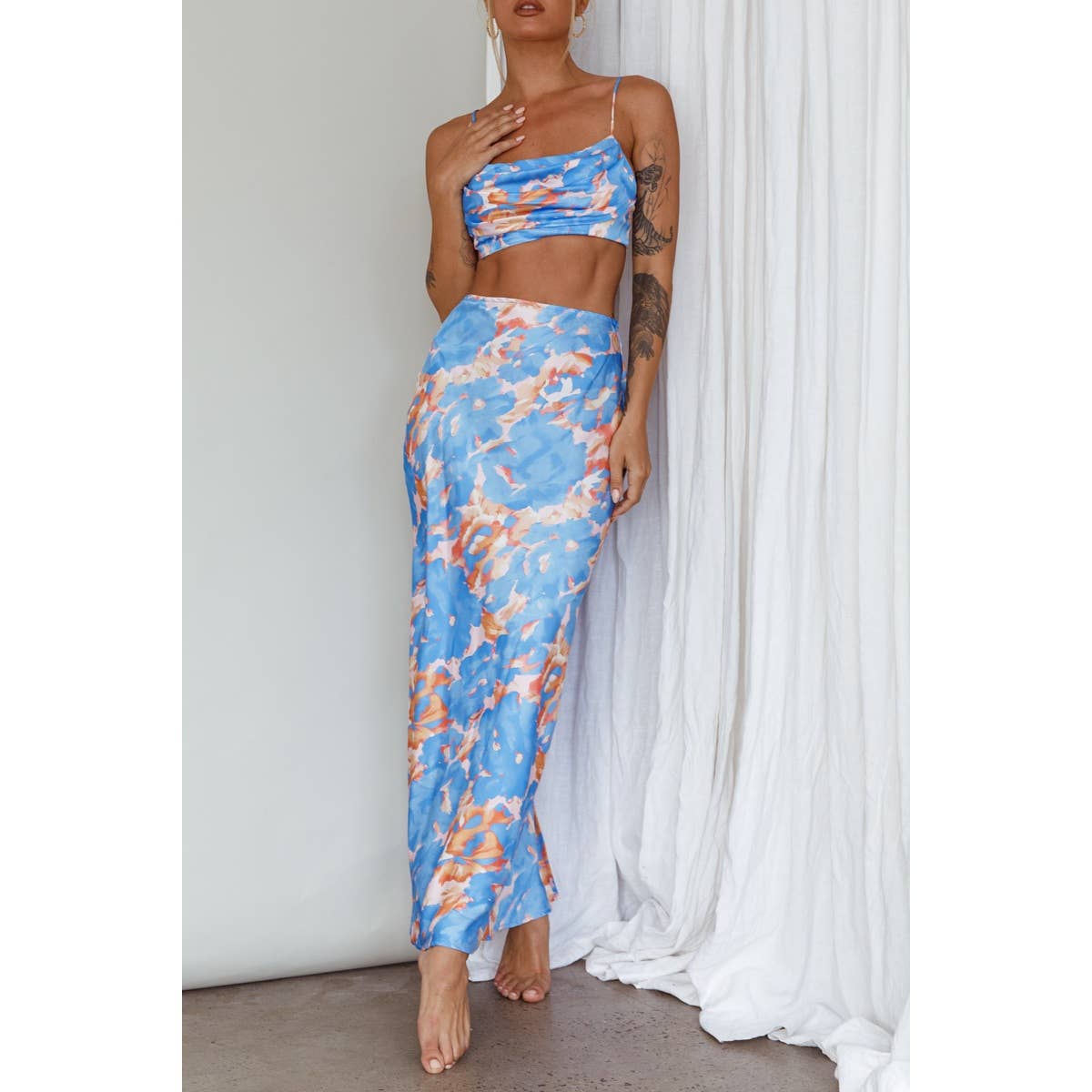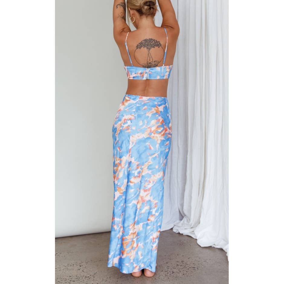 ABSTRACT CROP TOP AND SKIRT SET WITH ADJUSTABLE STRAPS AND ZIPPER IN BACK