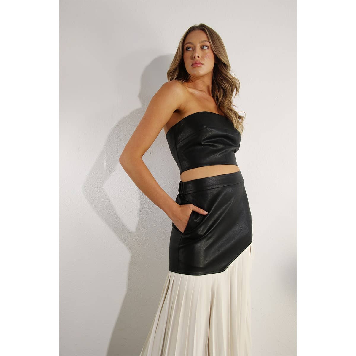 Leather crop top with pleated slit skirt!