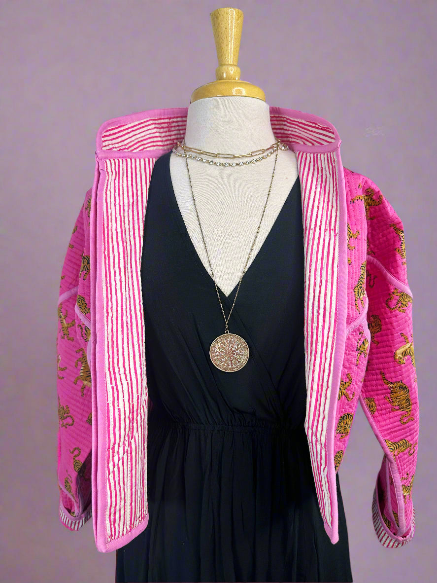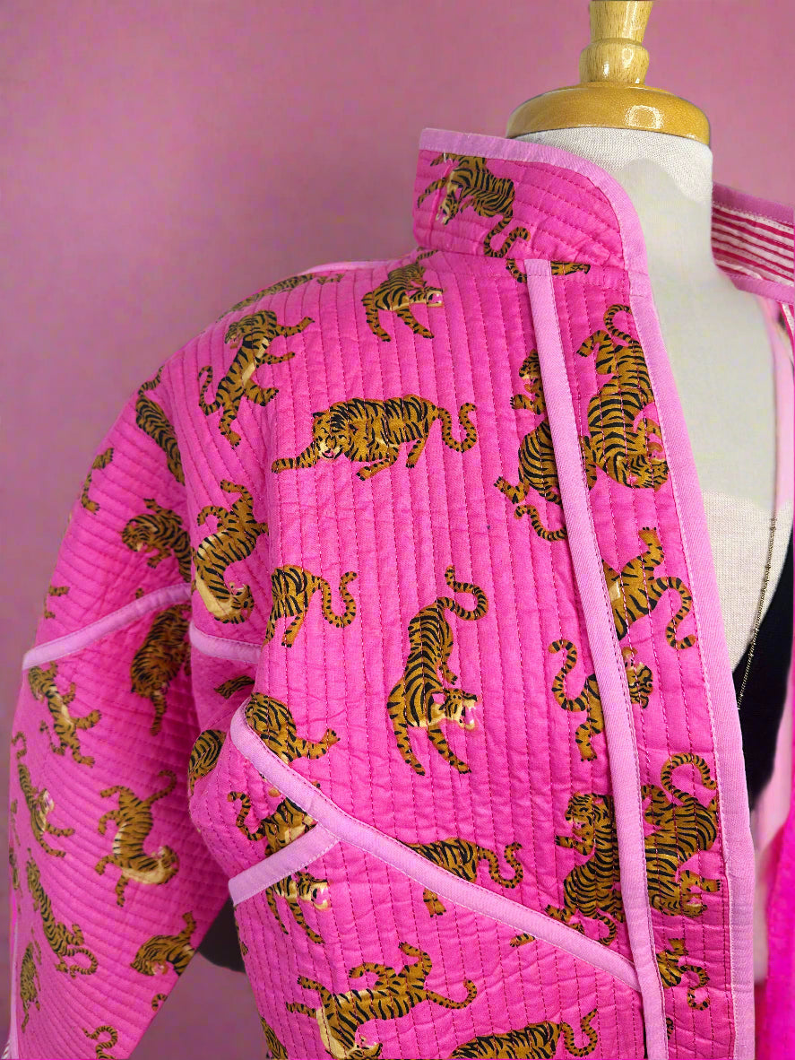 Handmade quilted bomber jacket made from 100% cotton printed fabric.
