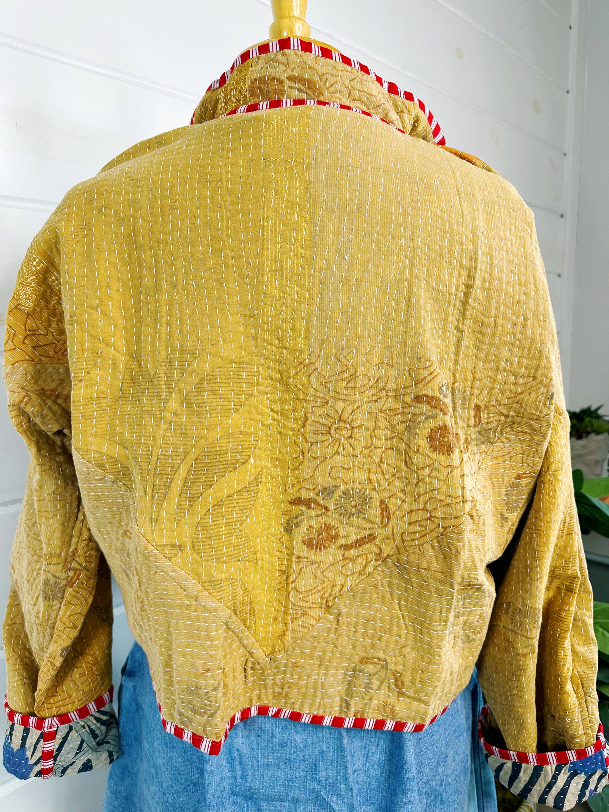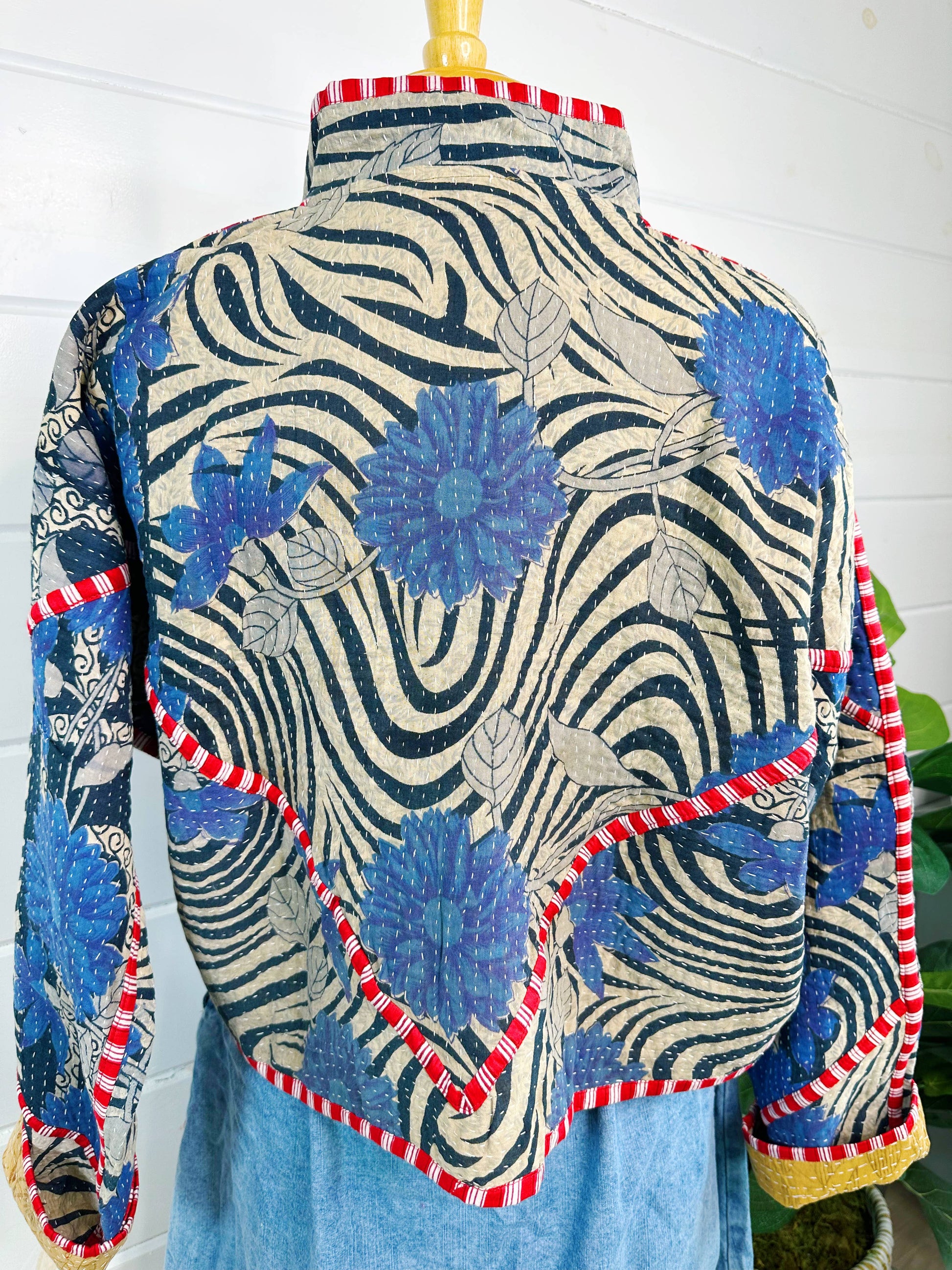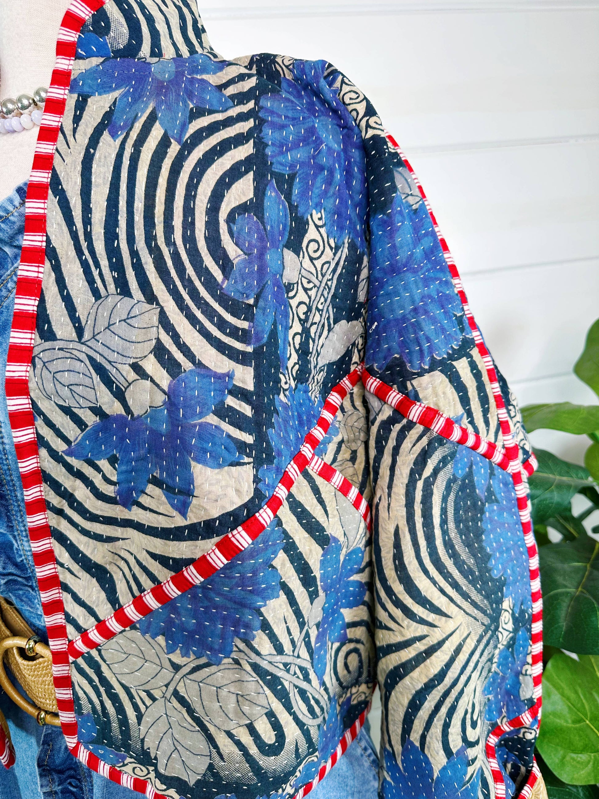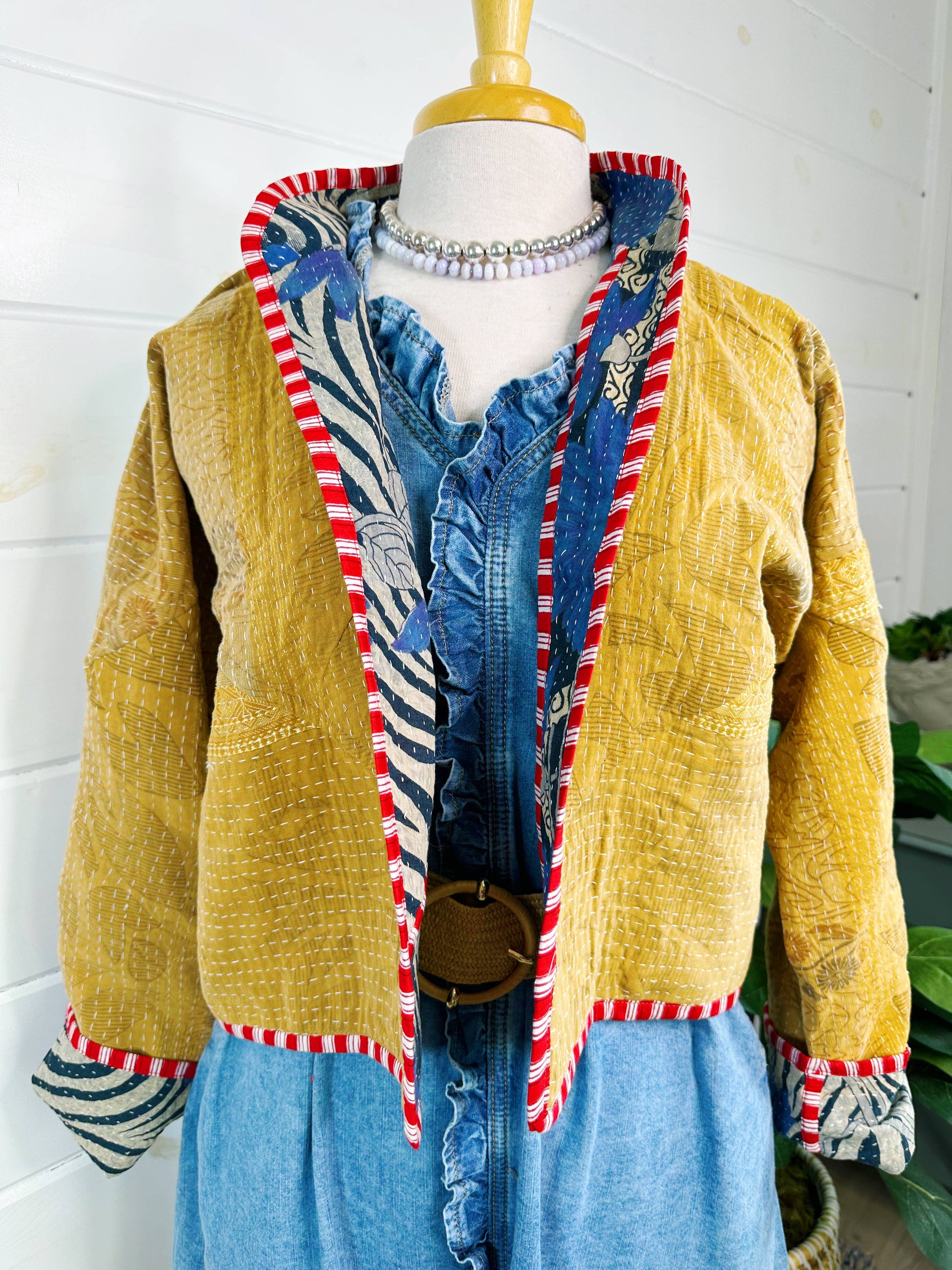 Kantha Quilted Bomber Jacket: An exquisite wearable art piece made from hand-stitched, repurposed Indian textiles. Versatile reversible design with exterior pockets. Lightweight and unique, with expected imperfections and vintage appeal. One size, approx. 22" in length, and varying weight and cuffable sleeves. Hand wash and hang dry.