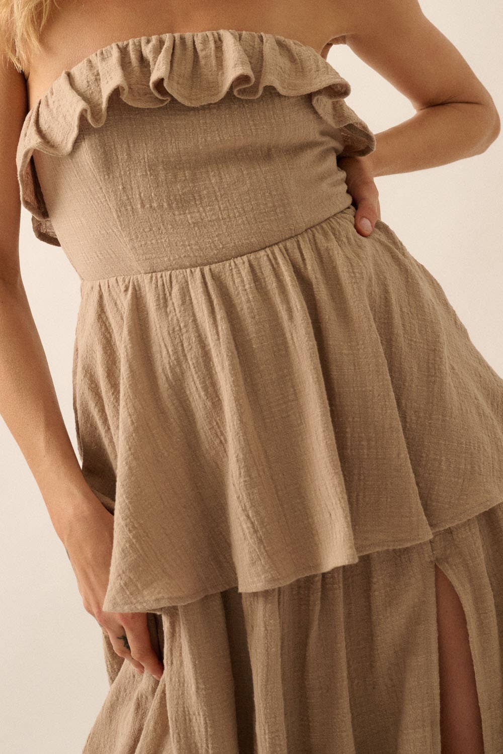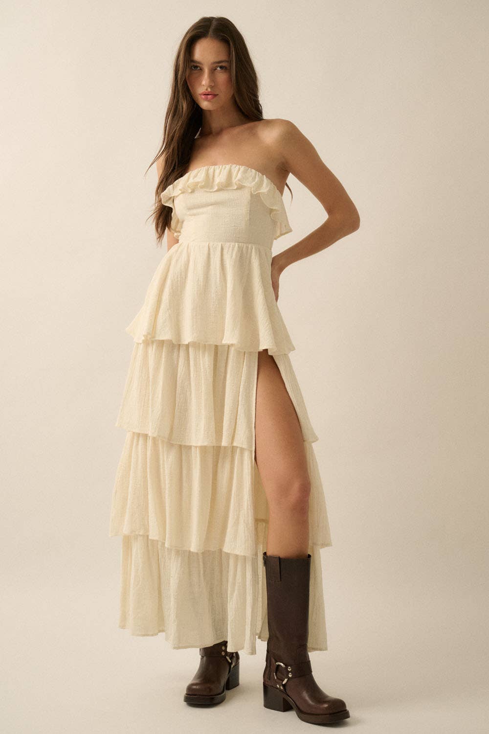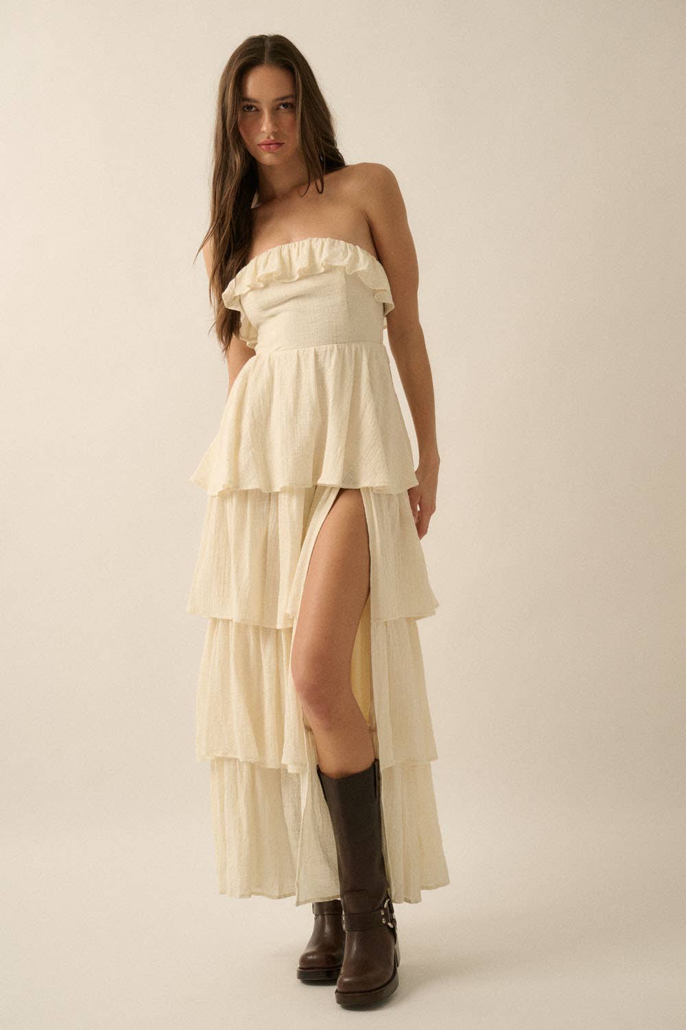 Textured Cotton Strapless Tiered Ruffle Maxi Dress